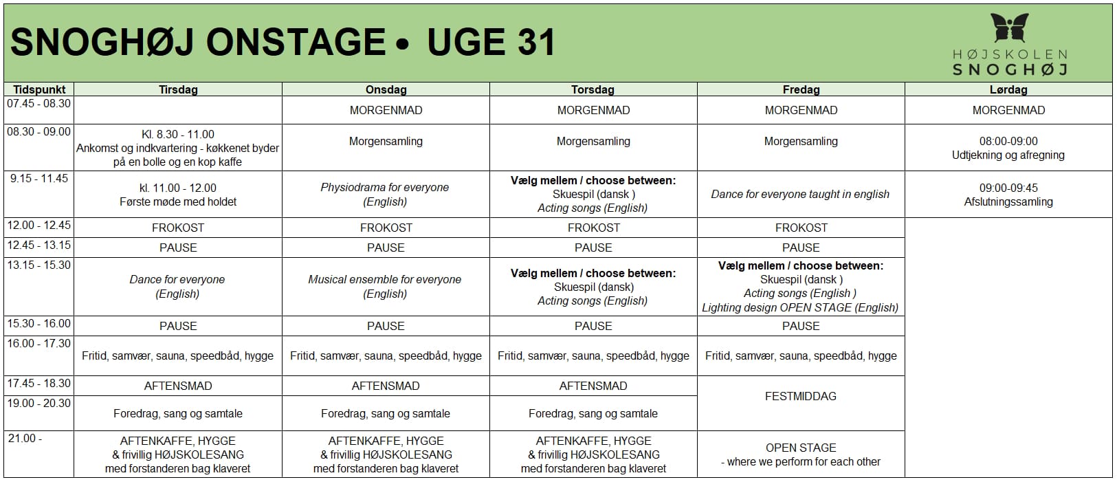 På Snoghøj ONstage får du mulighed for at møde stort set alle de fastansatte lærere på Højskolen Snoghøj, og de er alle lige vendt tilbage fra ferie – sprængfyldte af energi!